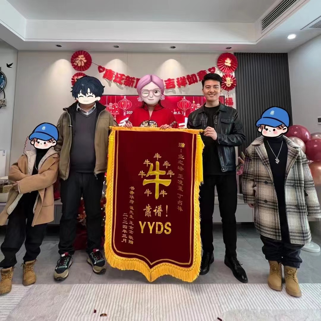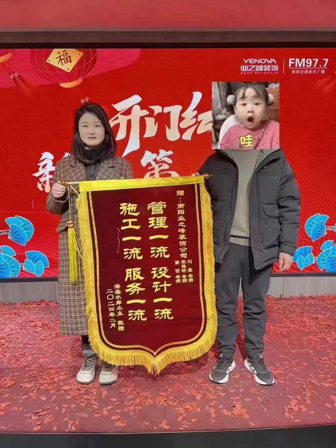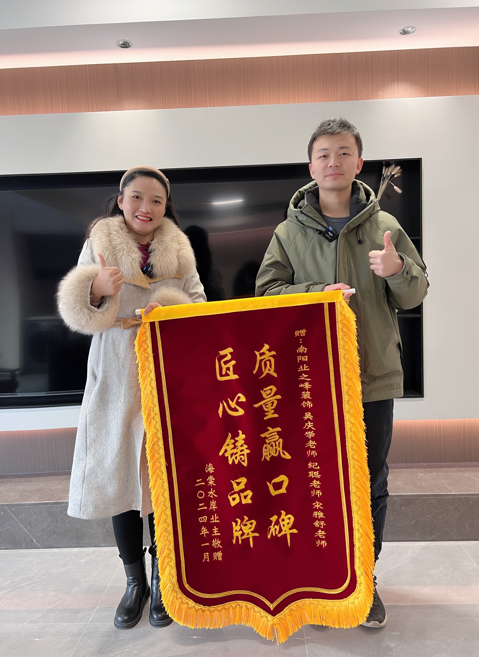 2024年二月,海棠水岸的业主们齐聚一堂,怀着无比的敬意和感激之情,向南阳业之峰装饰公司的刘鑫、宋亚舒、黛西三位老师敬赠锦旗。这面锦旗上绣着“管理一流、设计一流、施